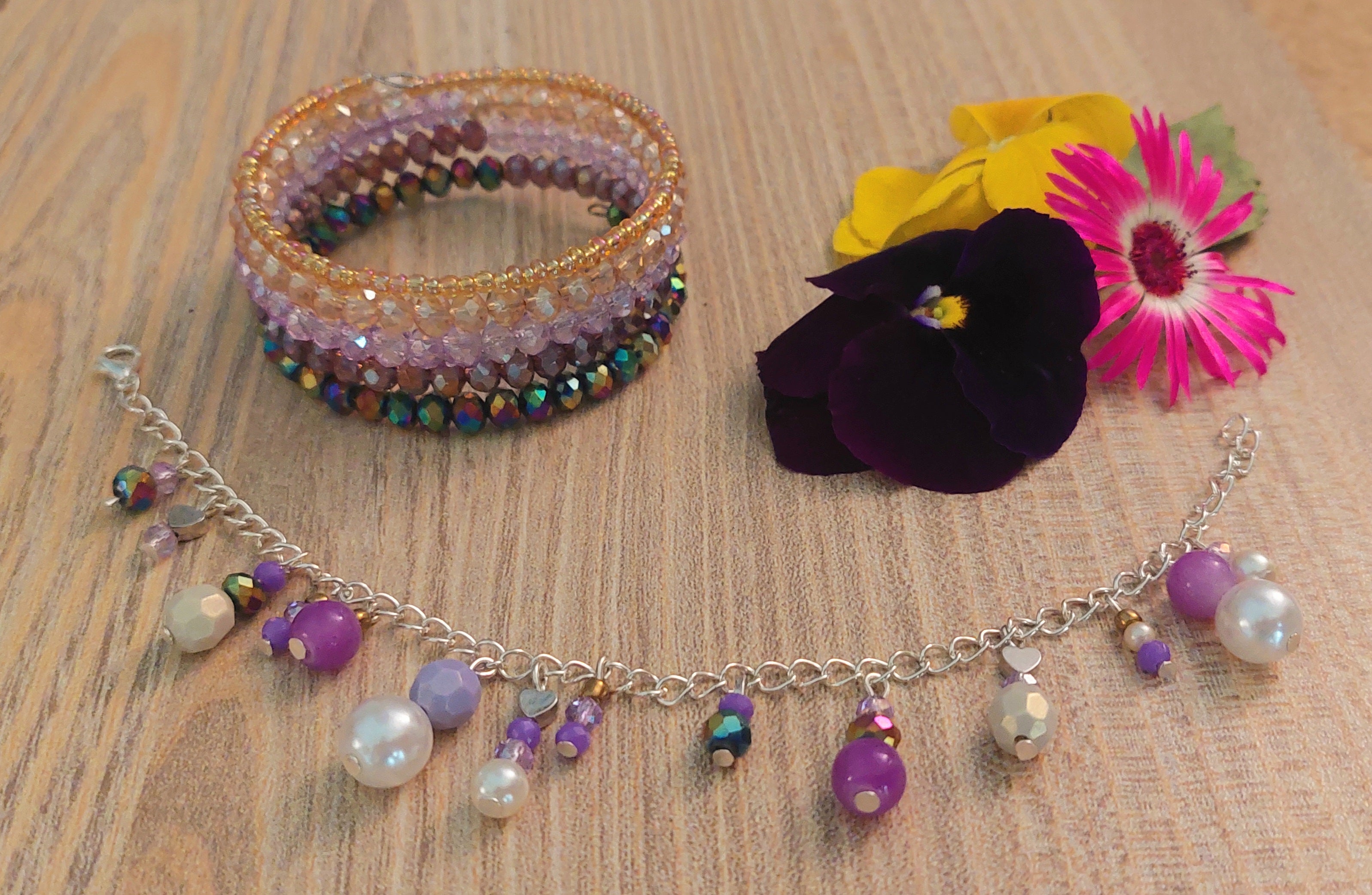 I use a variety of beads, such as acrylic and glass, to semi- precious stones, depending on the product. Materials include skin-friendly metal chains and durable memory wire.